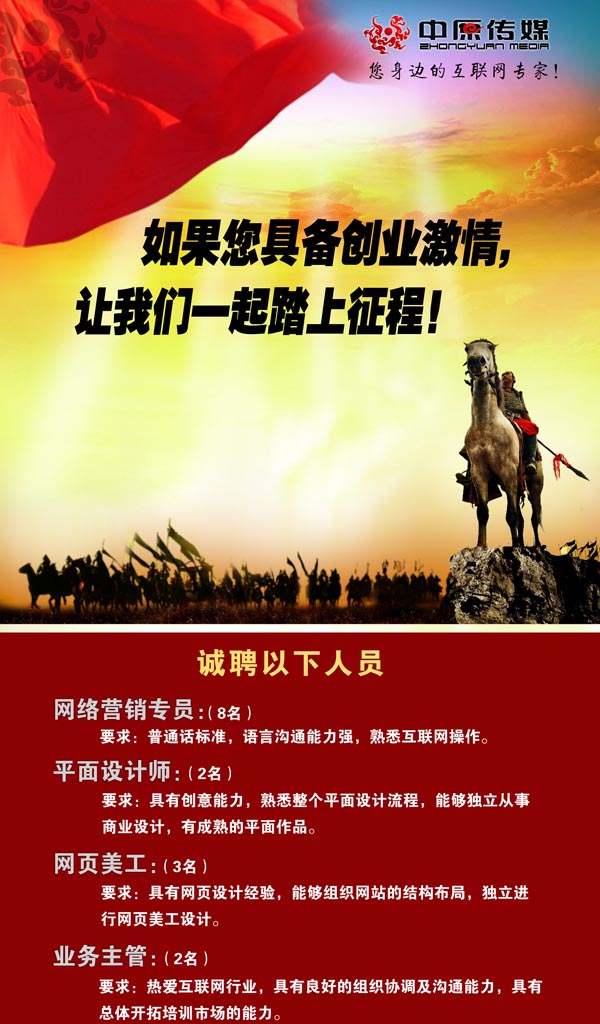 應(yīng)聘須知:中原傳媒要求應(yīng)聘者要具有挑戰(zhàn)的精神,具有創(chuàng)業(yè)的激情,認同公司的發(fā)展,能與公司長期的一起發(fā)展下去。意向者請發(fā)簡歷至公司信箱zkzycm@163.com,或者直接電話聯(lián)系13939438668